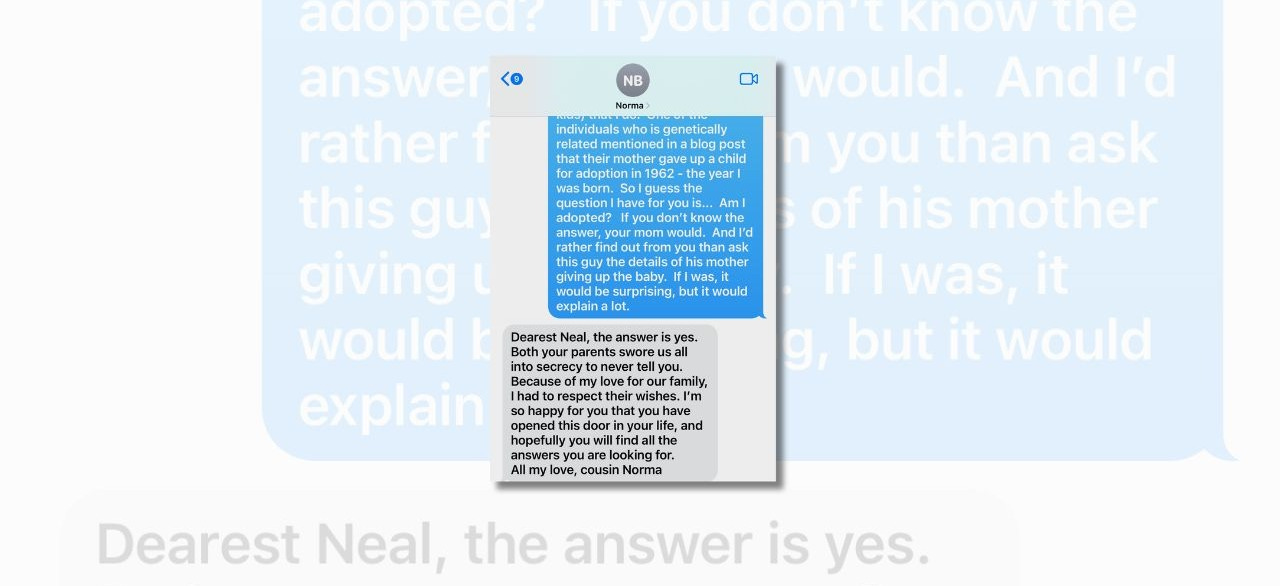 “Yes, you were adopted, but your parents swore everyone in the family to absolute secrecy.”